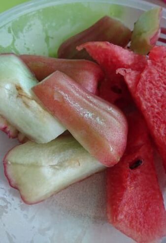 - Pink Thai Apple – chompoo which is like a cross between an apple and a pear, seeds in the middle, eat like an apple but softer like a pear.